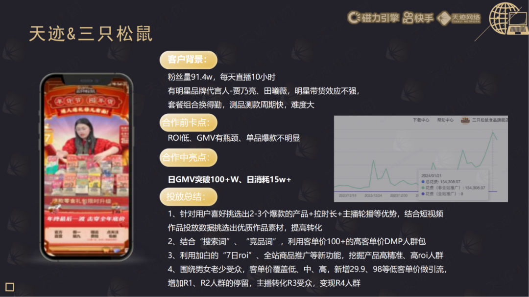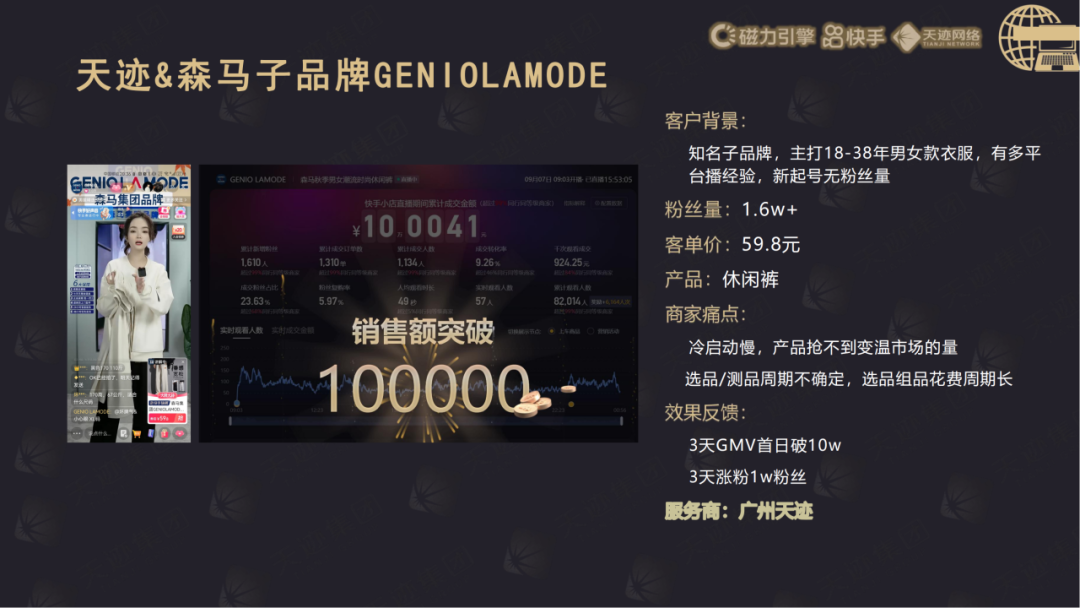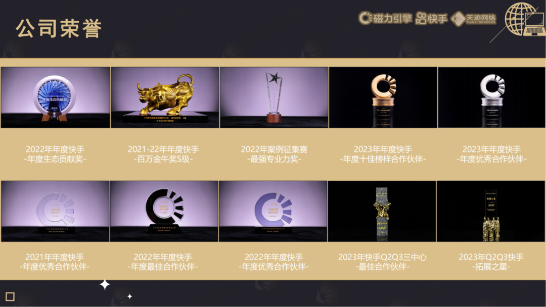 广州市天迹网络有限责任公司,公司团队规模400+人,旗下有6家公司,成立至今17年。公司秉承“用心创造效果”为经营理念,致力于为快手全国大主播服务以及中小主播做孵化。快手电商领域行业Top服务商。2023年孵化商家10000+ ,主播总粉丝量3.5亿+ ,操盘单场最高GMV10000W+, 2023年商家GMV 55亿+,磁力金牛消耗突破 16亿+,200+名官方认证的超高水平操盘手。298+人的快手团队,其中快手运营人员160人。为男装、女装、鞋子、美妆、护肤、食品、日百、珠宝玉石等十余个行业的直播卖货商家及短视频卖货商家提供广告代运营、投放优化、创意制作、活动/直播营销策划、数据分析、货盘优化、GMV提升等集数据力、策划力、内容力于一体的操盘团队,持续帮主播突破新高!
